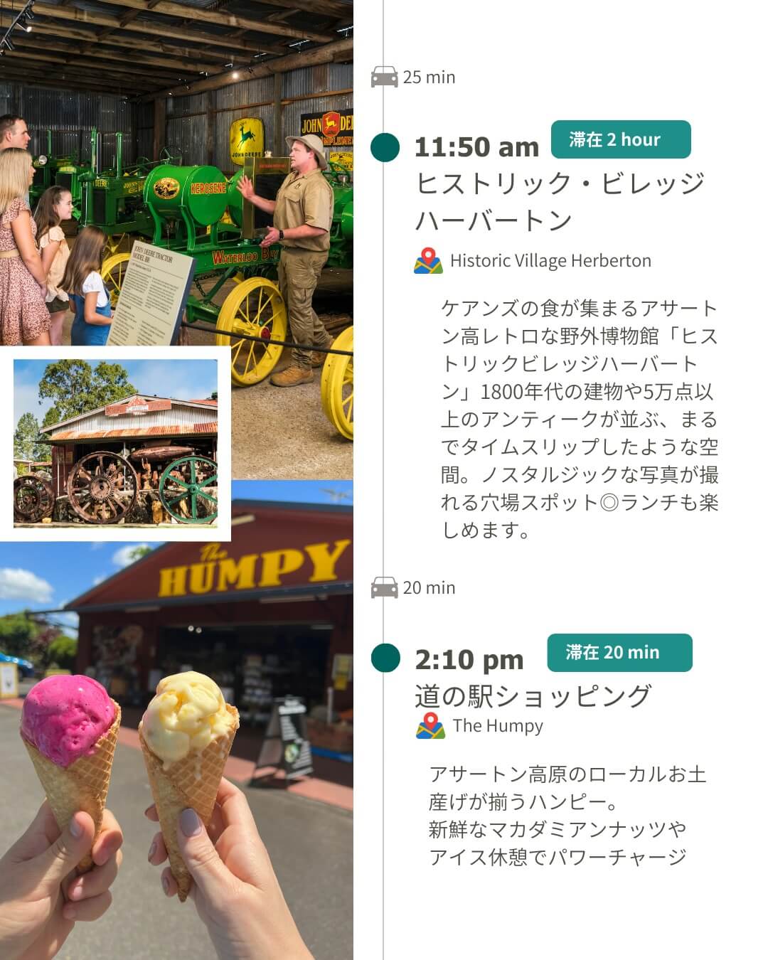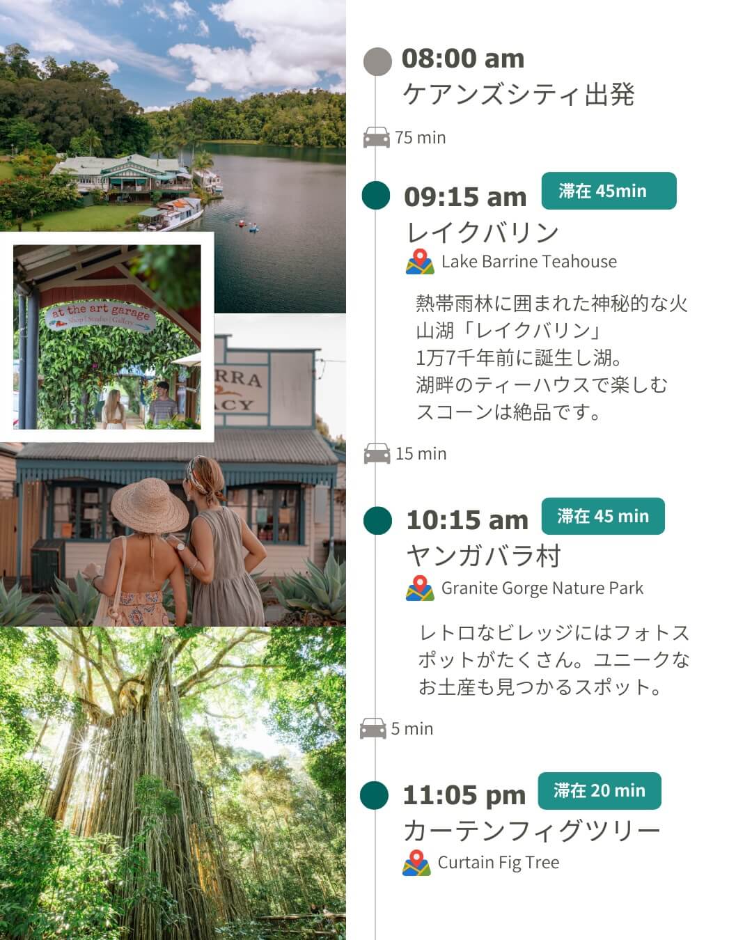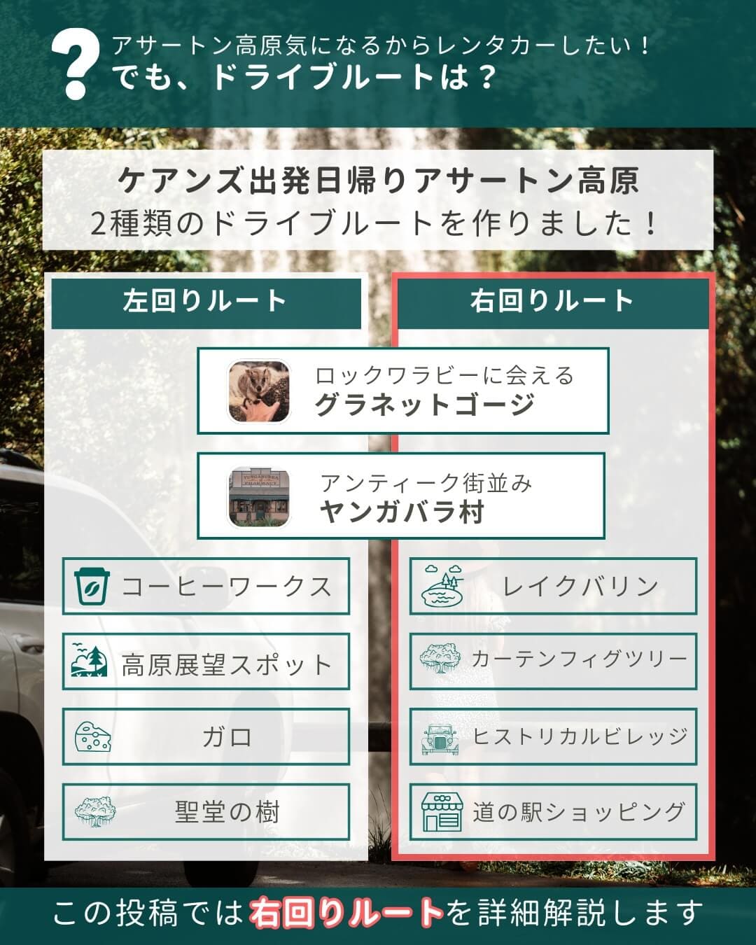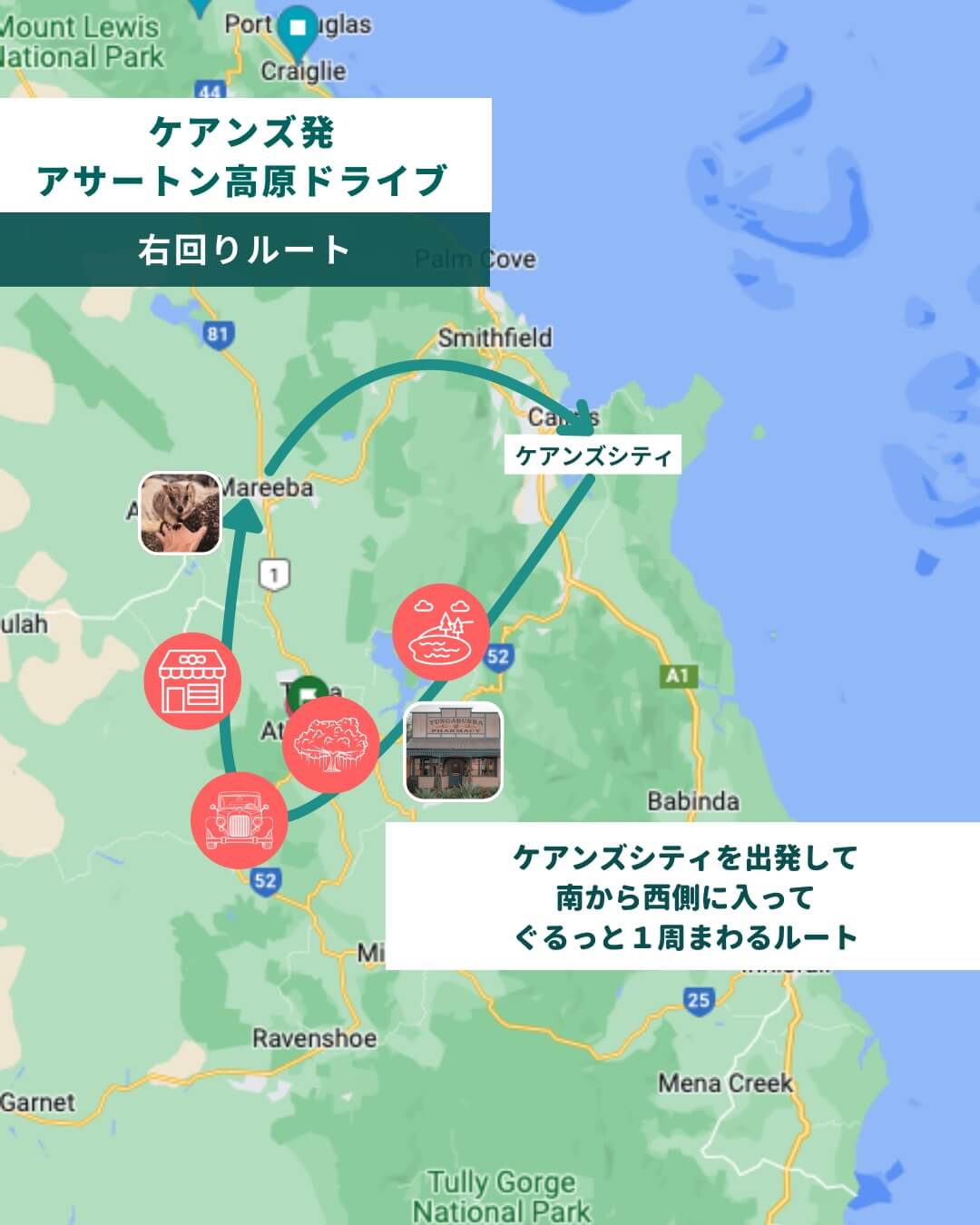 ケアンズからレンタカーで日帰りドライブ。アサートン高原を一周する「右回りルート」をご紹介します。朝8時にケアンズを出発して、夕方5時ごろに戻ってくる、充実の1日プランです。