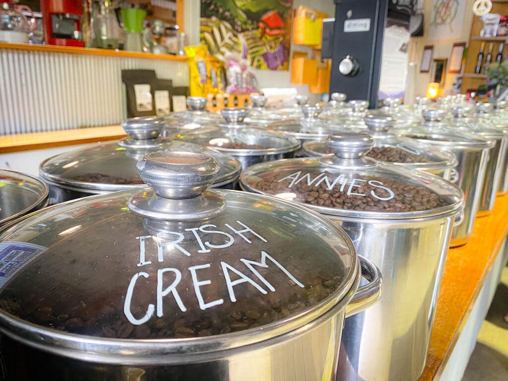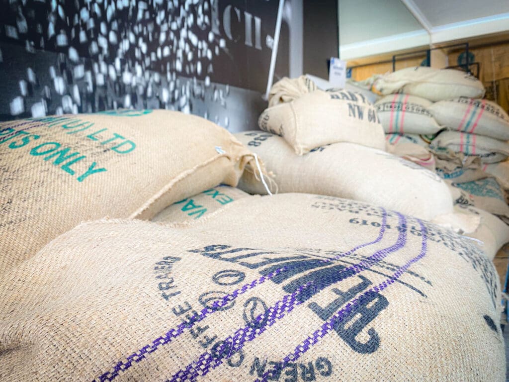 入口にはコーヒー豆が入った缶がズラリと並んでお出迎え。持ち帰りの方は、ここでコーヒー豆を選んで注文するのですが、カフェはこの奥にあるので進んでみましょう。