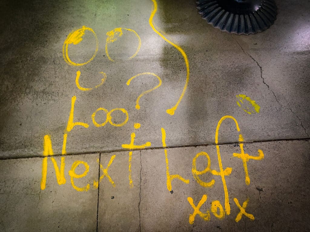店内は、お土産用のコーヒー豆や、カップなど、雑貨類が並んでいます。足元に目をやると、こんなペイントにも出会えます。雑貨の間を抜けて、奥に進むとカフェカウンターが見えてきました。