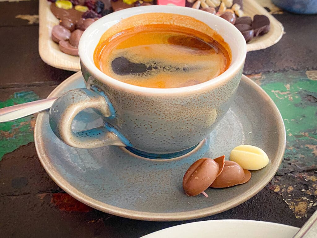 パンとは別に、同店はチョコレートにも力を入れていています。お皿に盛られたチョコレートの種類が豊富なのですが、見てください。よく見ると、コーヒー豆の形をしたチョコレートがありました。可愛い見た目に、思わず心奪われます。