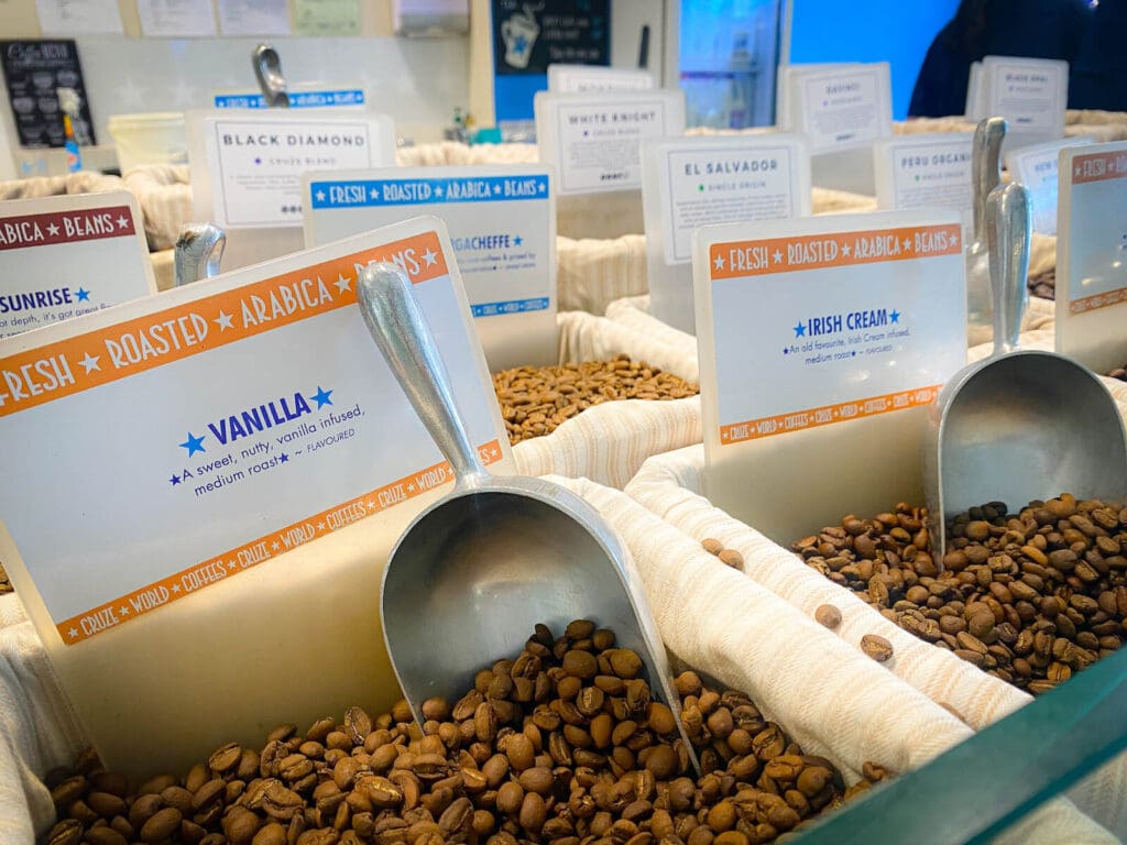 ケアンズセントラル・ショッピングセンターに向かう途中のグラフトン通りにある「クルーズコーヒー(Cruze Coffee)」。店内には常時30種類以上のコーヒー豆を置いていて、一歩足を踏み入れると、ふわりとコーヒーの香りに包まれます。この瞬間が至福のひととき。